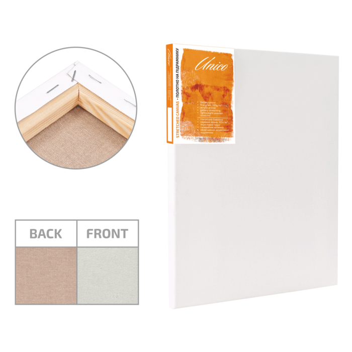 Опис Полотно на підрамнику бавовна 40х50 см, середнє зерно 335 г/м2, акрил, Італія Unico Light